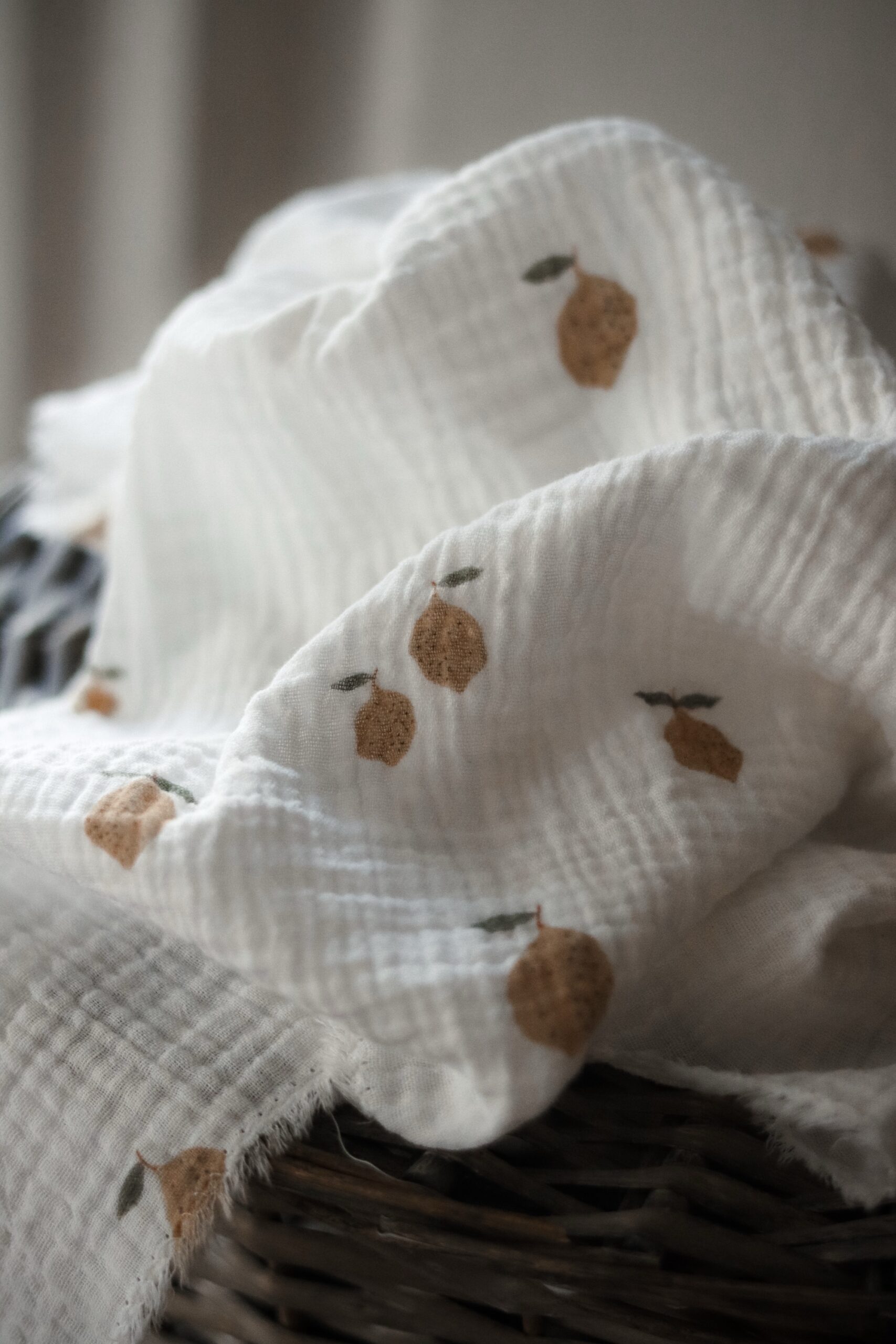 Weisses Musselin Nuscheli mit Zitronen.