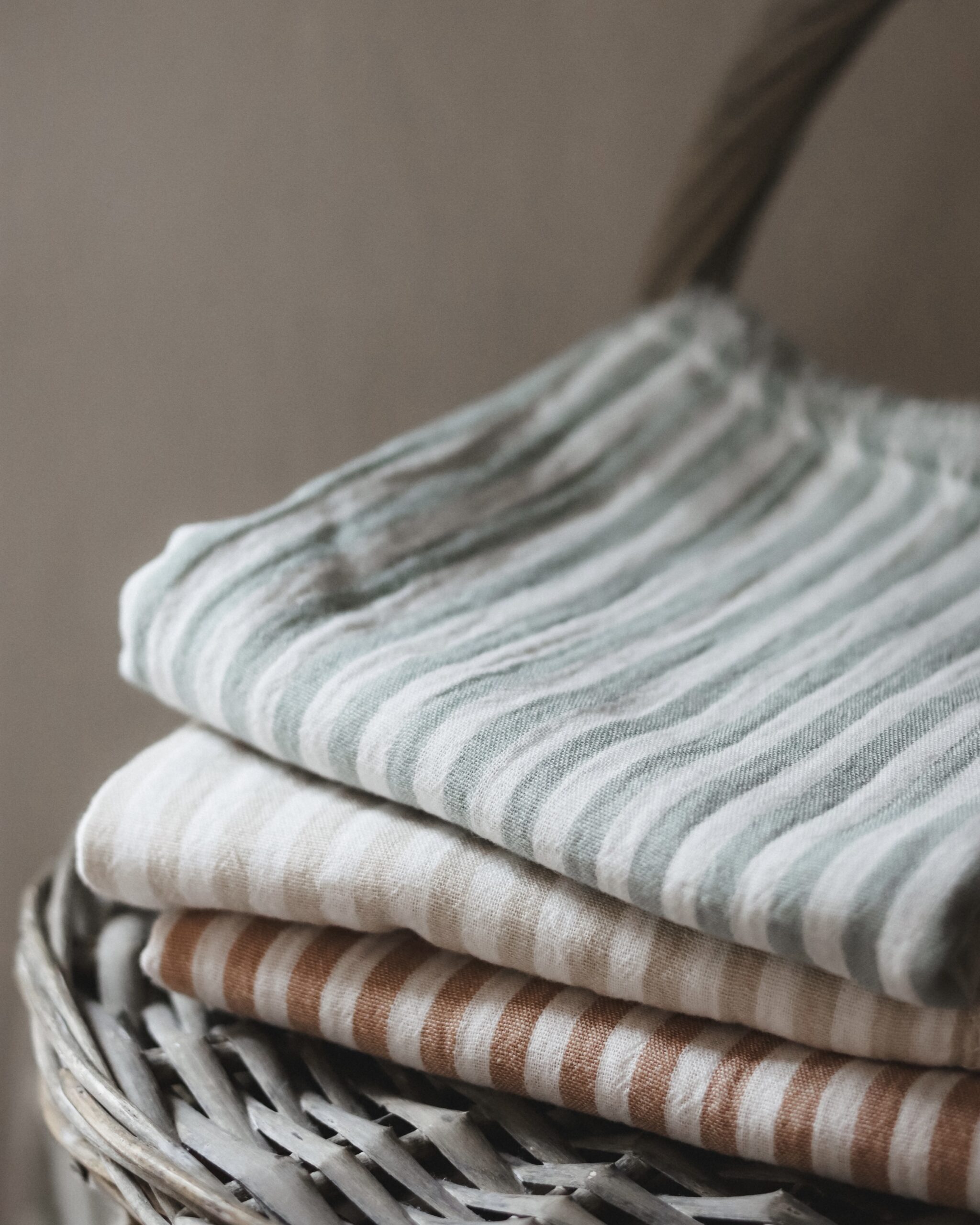 Nuscheli Trio bestehen aus dem LEAlina, LEOlina und LIOlina Nuscheli. Besonderheit an diesen Stoffen: Vorderseite mit breiten Streifen, Rückseite mit feinen Streifen.
