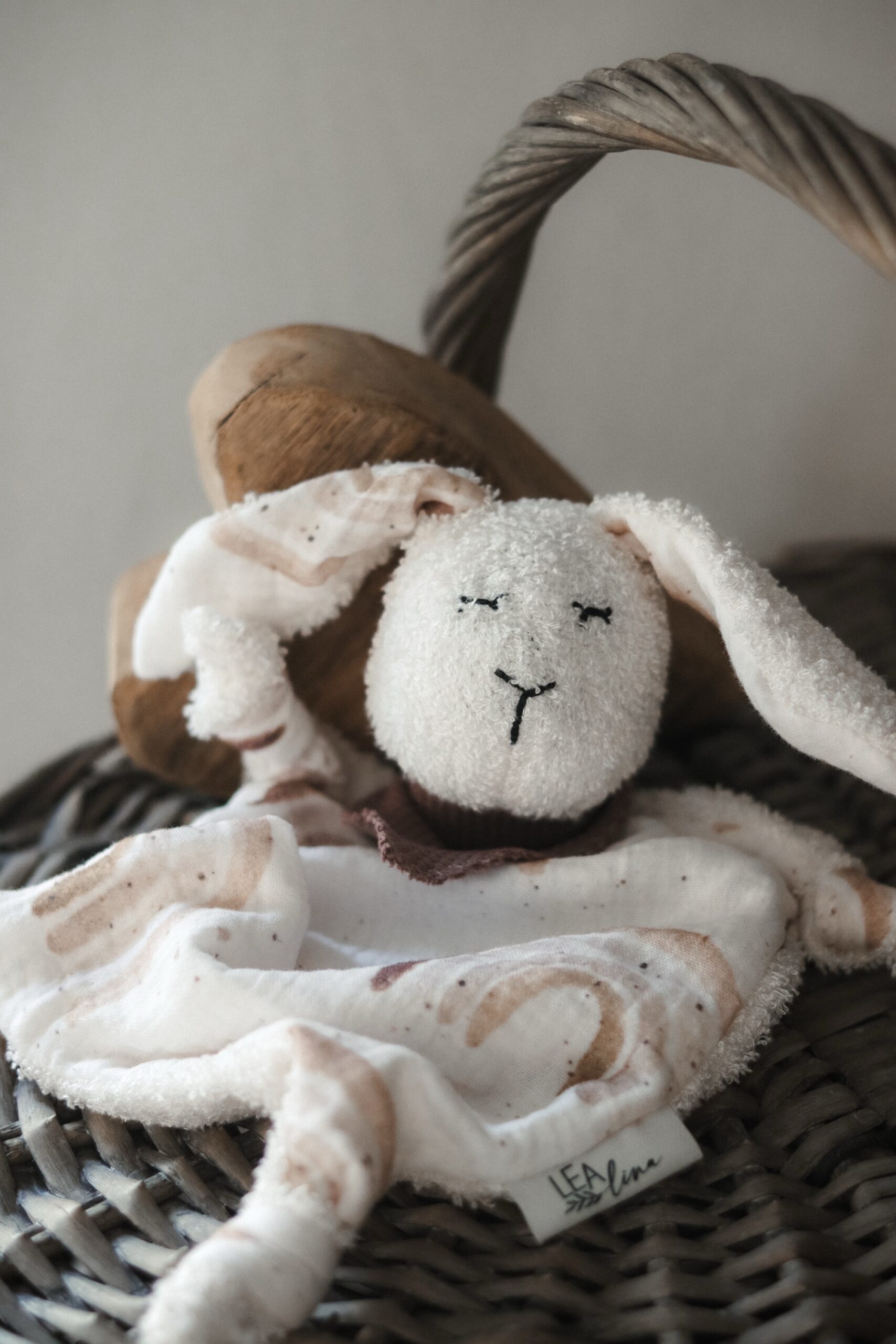 Schnuffelhäsli aus weissem Kuschelfrotte und Regenbogen-Musselinstoff. Ein treuer Begleiter für jedes Baby von Anfang an.
